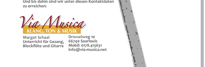 Unterricht für Gesang, Blockflöte, Gitarre, Musikunterricht, Musikschule im Kreis Saarlouis, für Bous, Dillingen, Ensdorf, Nalbach, Rehlingen-Siersburg, Saarlouis, Saarwellingen, Schwalbach, Wadgassen, Wallerfangen, funktionales Stimmtraining, gesundes Singen, Ensemble, musikalischer Weg via musica, Stimme, Coaching, Vocalcoaching, Recording, Vorbereitung Musikstudium, Gesangstudium, Zugang zur eigenen Stimme, Individuell, Entwicklung, Musical, Rockmusik, Folk, Klassik. Dies sind einige Schlagworte zu den zukünftigen Informationen auf der Webseite von via-musica.net |